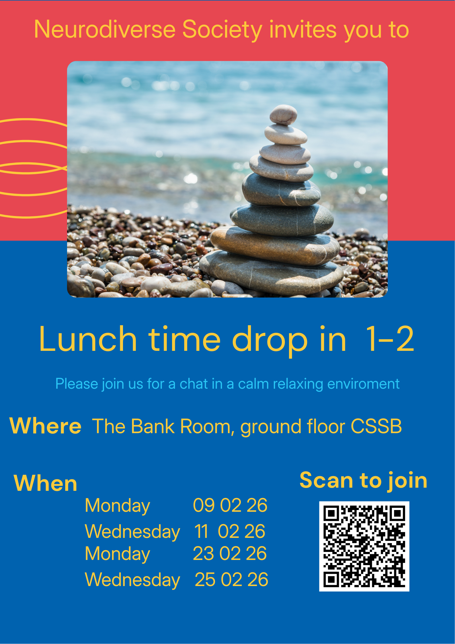 Lunch time drop in, come in and say hello. The lunch time drop ins are a great way to meet other neurodiverse students and to make plans for activities that we all might like to try and engage with. Please come along and let us know what you would like to try out.