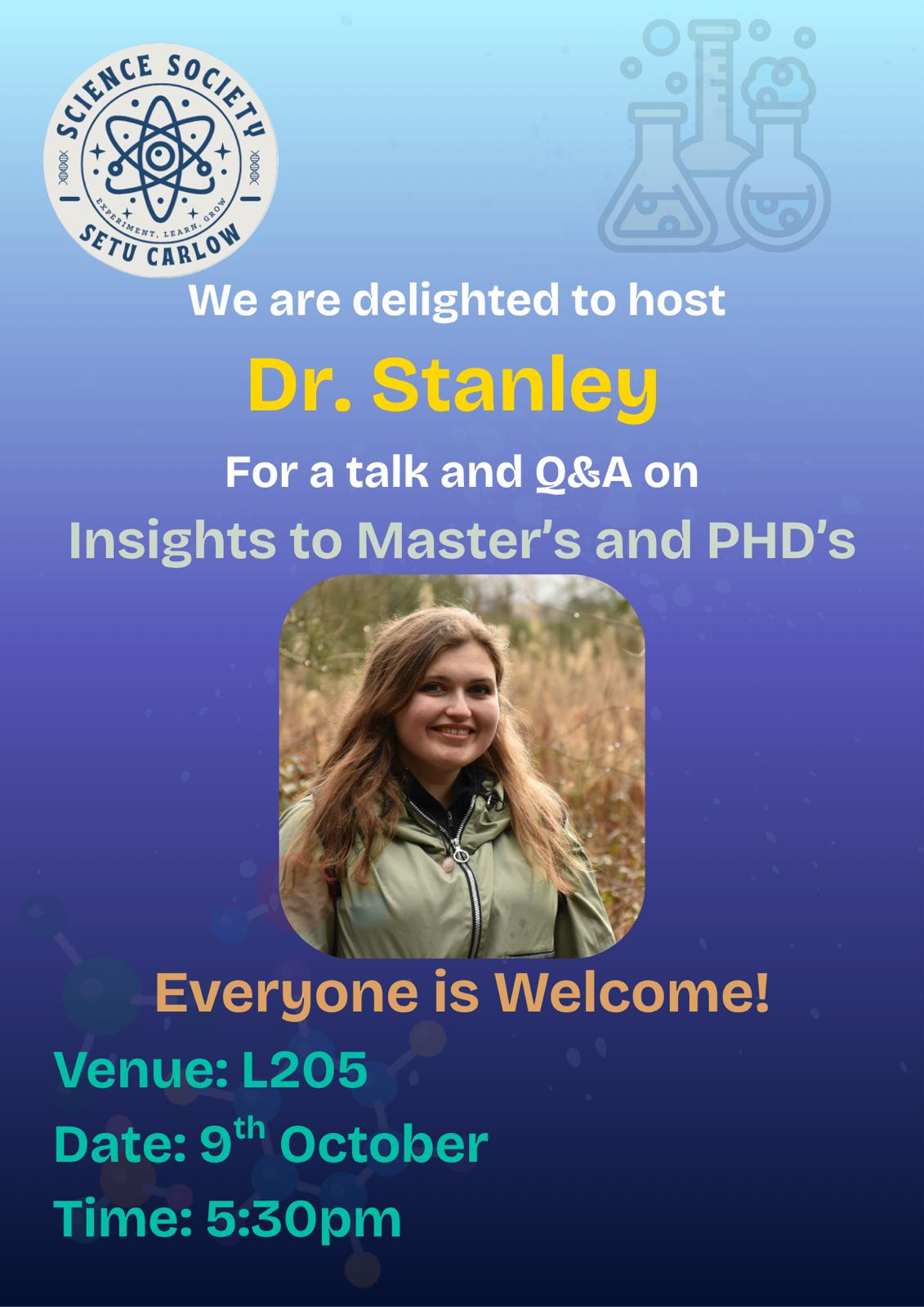 Dr Stanley will be visiting the Science Society on the 9th October at 5:30pm to give a talk on Masters and PhD programmes and for a Q and A session after the talk.